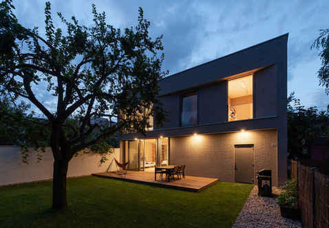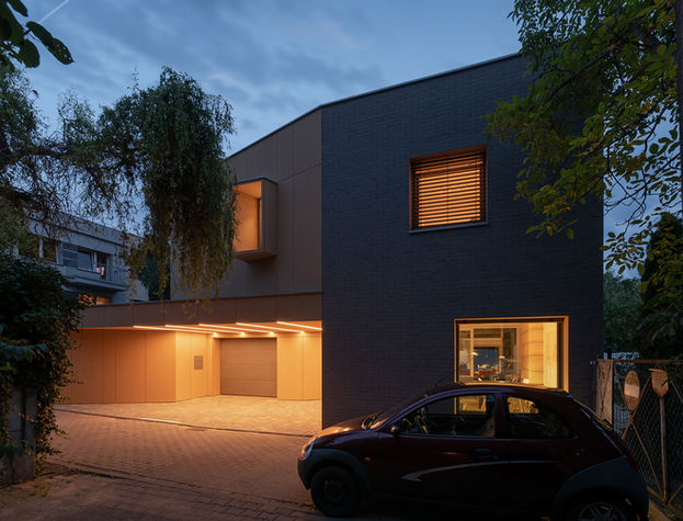 Dom zbudowany został w drugiej linii zabudowy w pobliżu Cytadeli w Poznaniu. Stanął na działce, która ma 250 m kw. powierzchni. Wcześniej w tym miejscu znajdował się niewielki budynek usługowy. Dawne zabudowania wyburzono, ale zachowano rosnące na działce stare drzewo. Udało się nam zaprojektować piętrowy budynek z garażem, który ma 155 m kw. powierzchni.