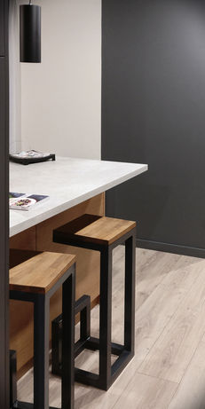 Centralna wyspa mieści w sobie wielofunkcyjny mebel, schowki oraz szafki, duża szafa ukryta jest za lustrem. Elementem zespalającym całość jest drewno oraz stalowe ramy tworzące autorskie meble.