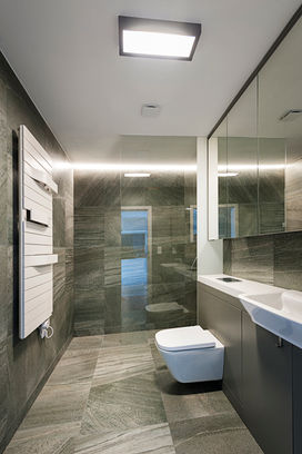 Chłód kamiennych płytek koi zmysły, podczas gdy ciepło drewna pod stopami i dłonią dodaje pewności i przytulności. Elastyczność oświetlenia pozwala na dostosowanie atmosfery do potrzeby chwili.
