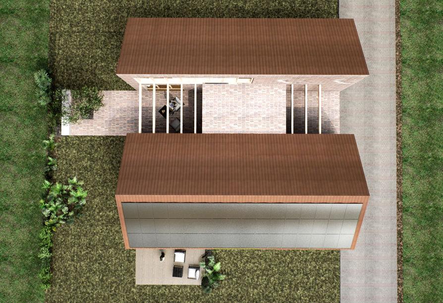 Dzięki temu uzyskaliśmy zreinterpretowaną formę, z wyglądu przypominającą półtorej stodoły. Wyciętą przestrzeń wyłożono ceglanymi płytkami, pozostawiając wyraźny ślad operacji bryłowej, oraz wyznaczając w zagospodarowaniu dojścia i tarasy.