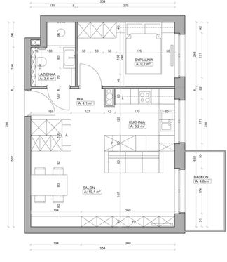 Słupek zabudowy kuchennej oddziela strefę kuchni i salonu. Dzięki temu na niedużej powierzchni uzyskaliśmy kilka stref i jednocześnie zachowaliśmy wrażenie przestrzeni.